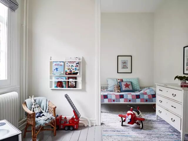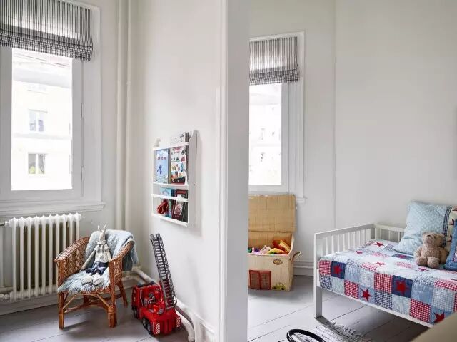 ▲ 用一小段墙将空间分为两部分,里面为休息空间,摆放了儿童床;外面为玩耍的地方,有玩具、小画书和小椅子。这种半墙隔断方式,不仅可以起到划分空间的作用,而且还不会让两个空间显得过于狭窄。小户型可以使用这种隔断方式哦~