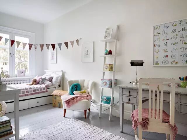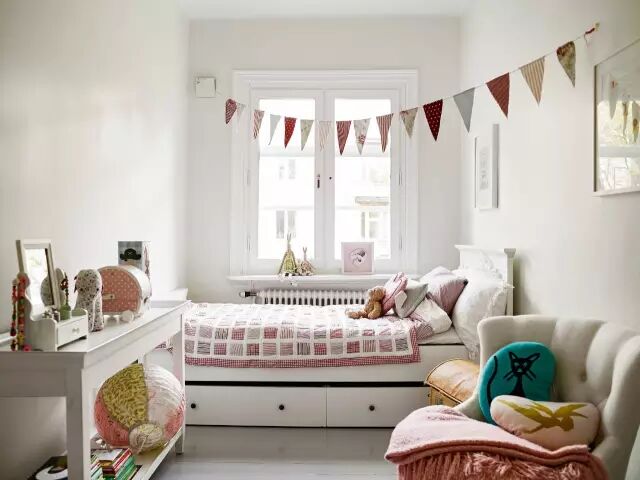 儿童单人床靠窗摆放,床下设计了抽屉,增加室内的收纳空间。床尾一张小桌,用来摆放书本和玩具,还有小小的首饰盒~