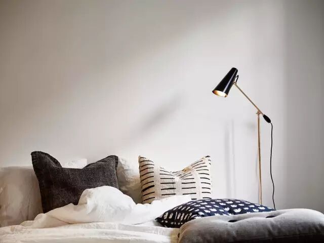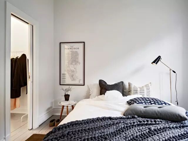 简简单单的双人床,没有床头,只有一面大白墙,看起来干净利落。
