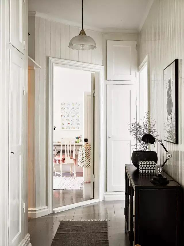 站在走廊看向玄关,门、墙壁、地板都是白色的,让狭窄的走廊不会显得那么阴暗。