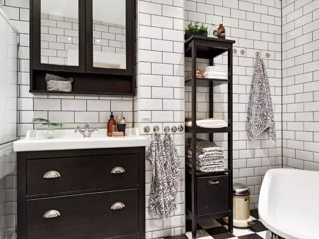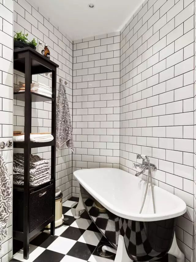 卫生间里,黑白相间的地板,白色的面包砖墙壁勾着黑缝,黑白色的经典搭配永不过时~各种类型的收纳柜,让这个小小的卫生间拥有足够的收纳空间。