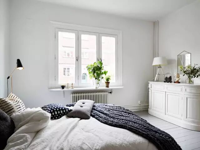 床尾放了白色的收纳柜,带有弧度的边缘,使室内线条更加柔和。明亮的窗台上一盆绿色的植物,为卧室带来清新自然的感觉。