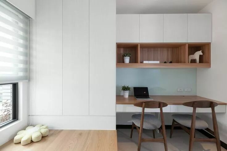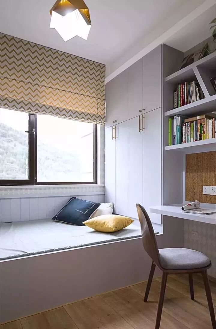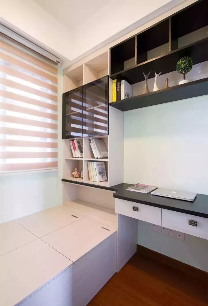 一个超级实用的榻榻米空间,可以结合靠墙而立的定制柜体,来提高整个房间的收纳机能,达到“一房多用”的目的。