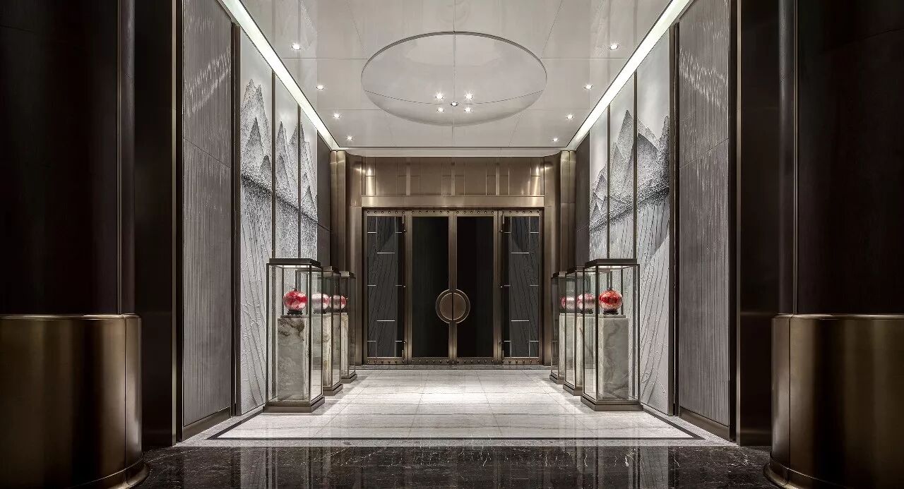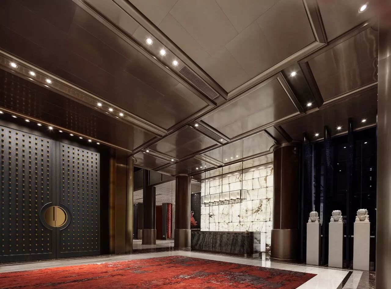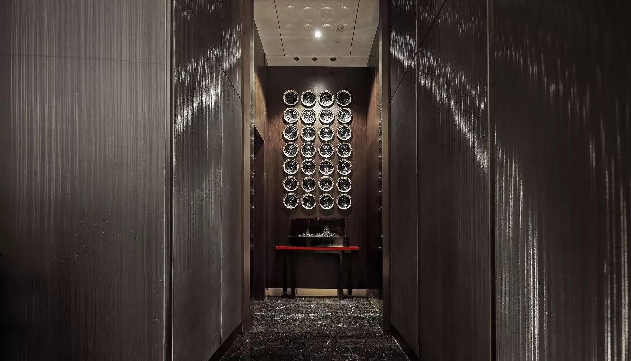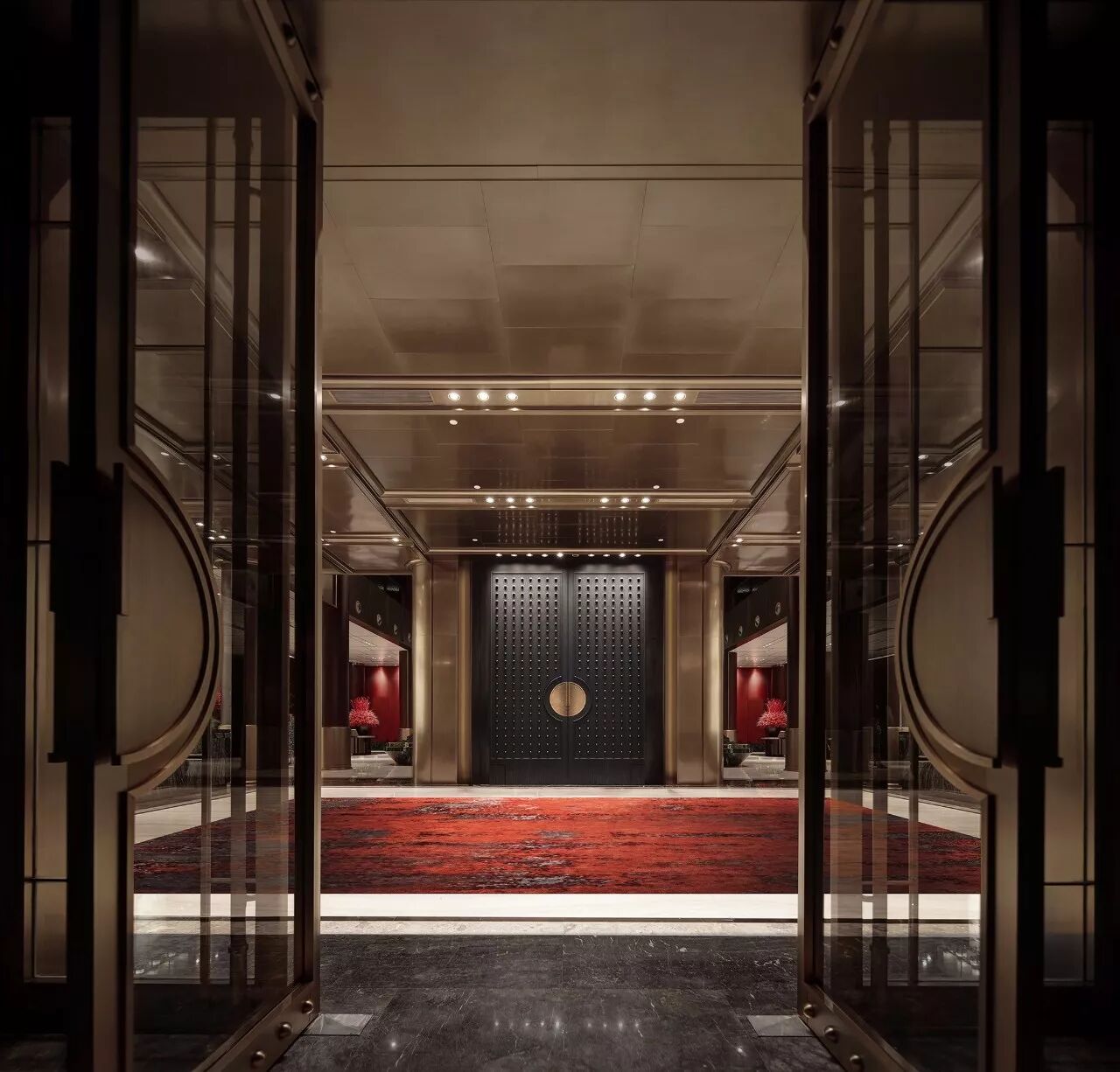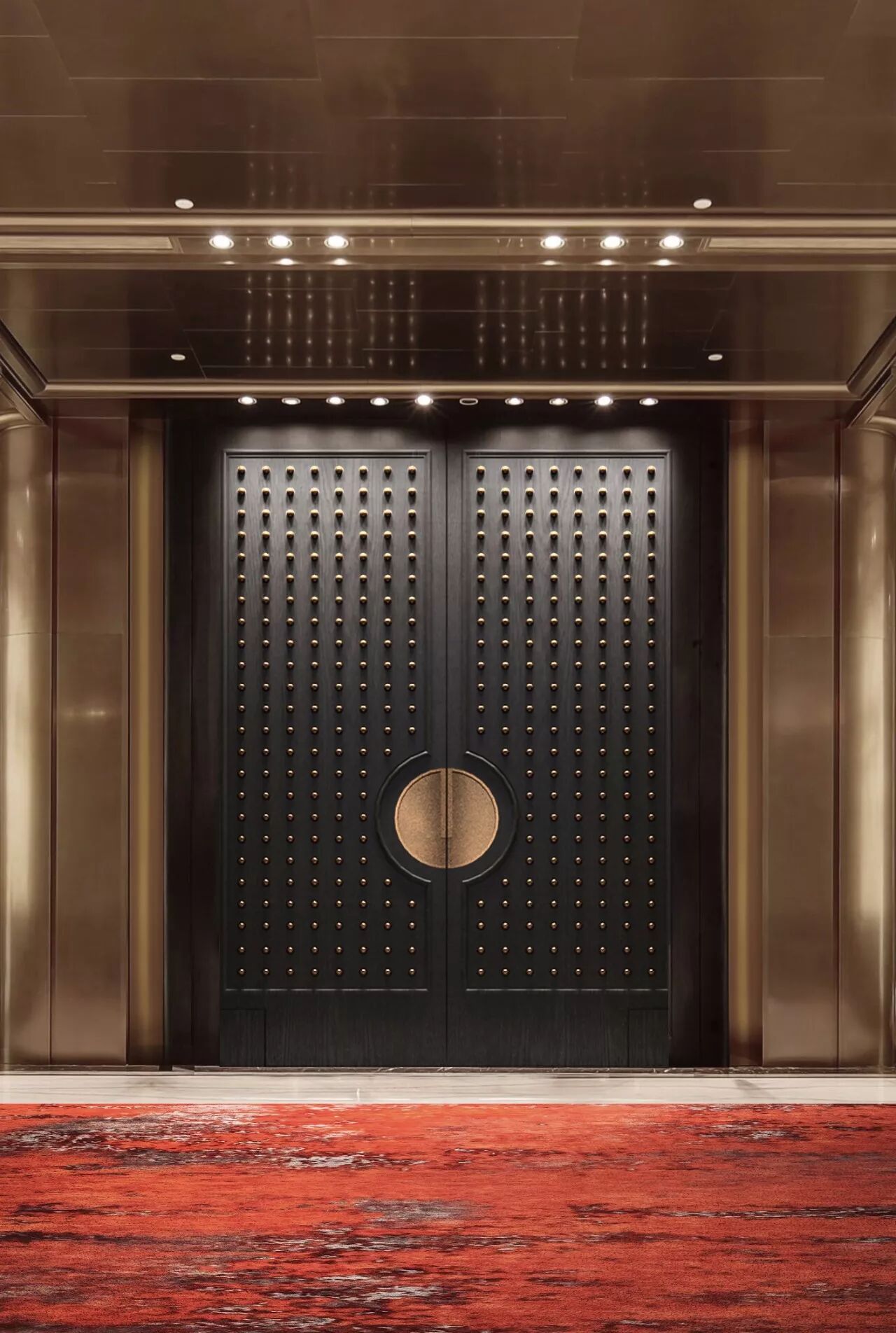左右对称、方圆并举,简约别致的玻璃大门有框景作用,在现代建制中低调而巧妙地纳入古时的审美。推门而入,迎面而来的却是另一扇气势更为磅礴的门墙,沉厚的黑铜、丰饶的金,高贵古雅的气息扑面而来。门是中国建筑艺术最为集中的体现,也是古代礼制、形制的代表物。古建新制,具象到抽象,不变的是其象征的意义。