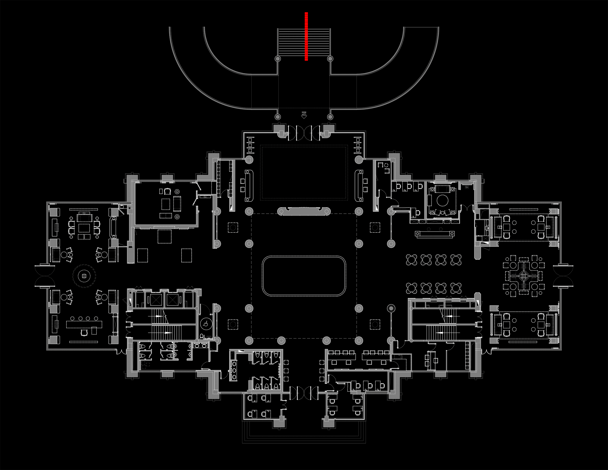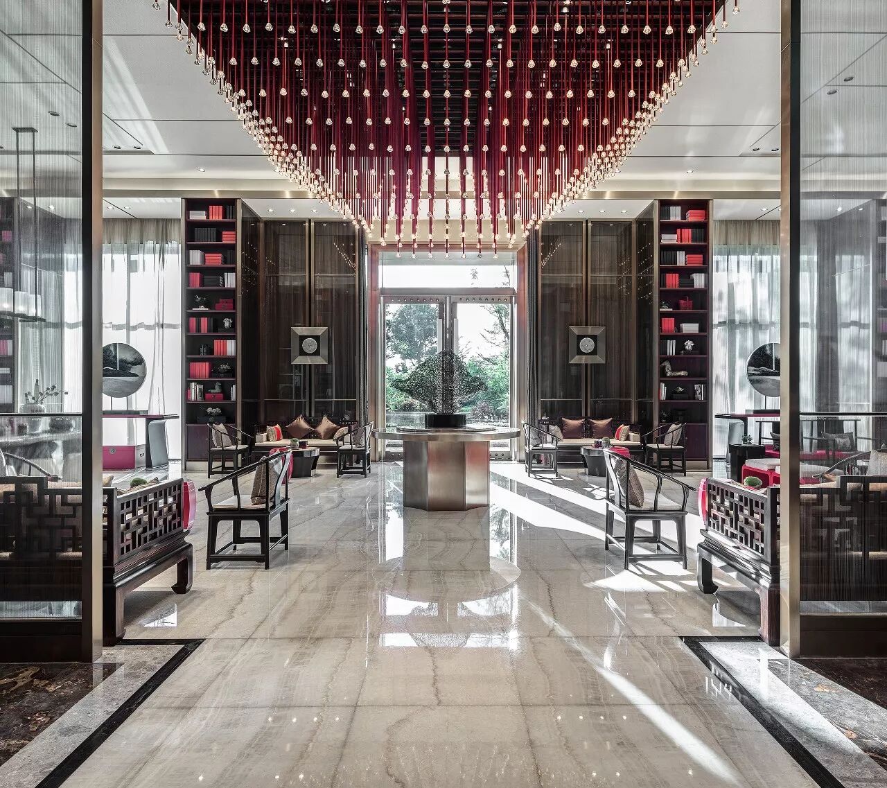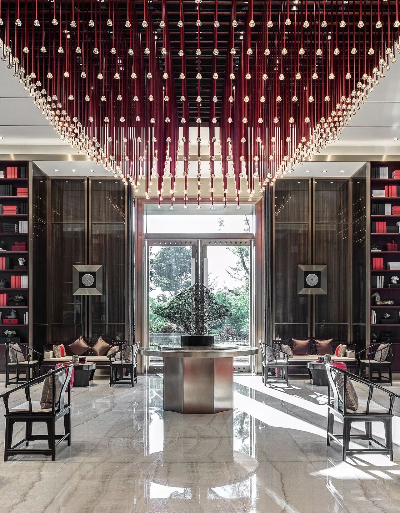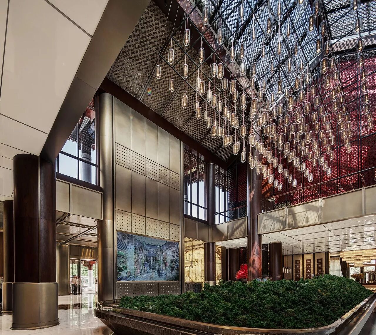 左右对称、方圆并举,简约别致的玻璃大门有框景作用,在现代建制中低调而巧妙地纳入古时的审美。推门而入,迎面而来的却是另一扇气势更为磅礴的门墙,沉厚的黑铜、丰饶的金,高贵古雅的气息扑面而来。门是中国建筑艺术最为集中的体现,也是古代礼制、形制的代表物。古建新制,具象到抽象,不变的是其象征的意义。