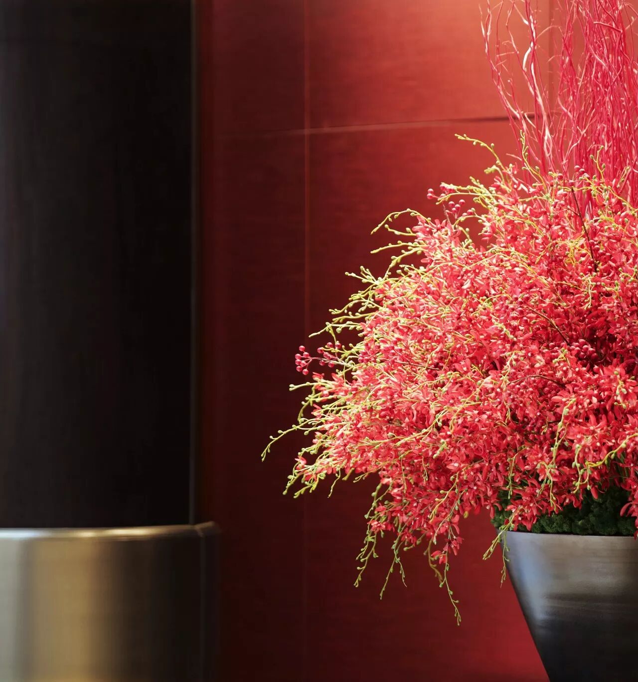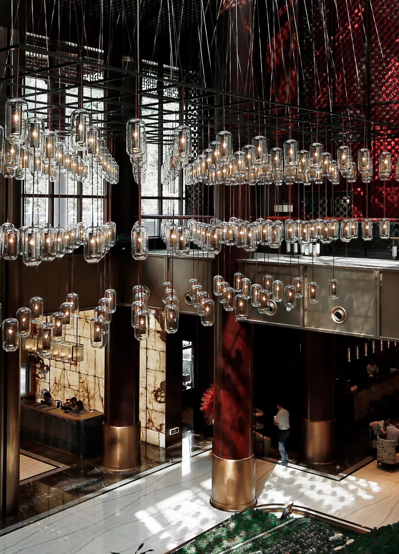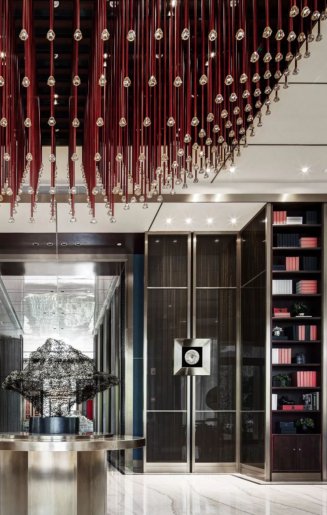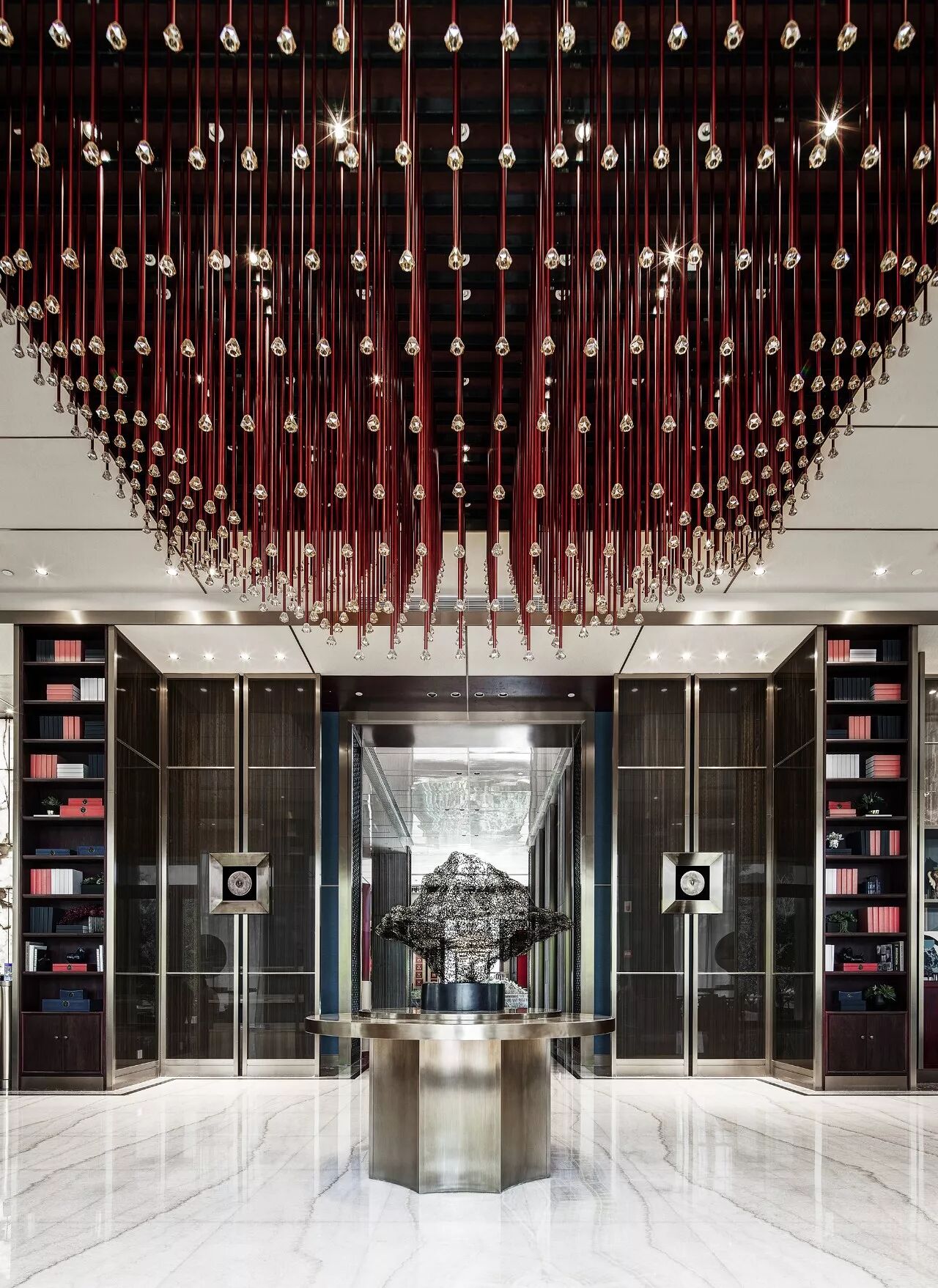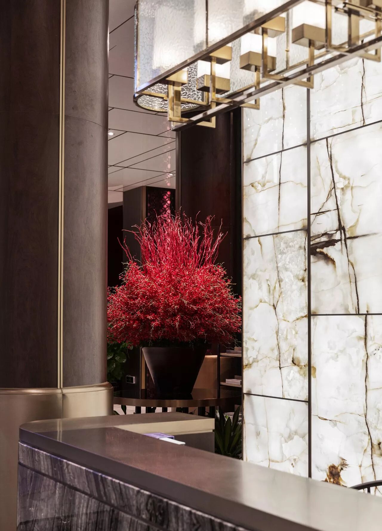 大气典重的空间主调中,肆意燃烧的红色地毯与两侧的挂画热情相望,似花开灼灼,似云霞漫天铺展,也让人想起辛弃疾的词“东风夜放花千树。更吹落,星如雨。宝马雕车香满路。凤箫声动,玉壶光转,一夜鱼龙舞,”天上地下,一片繁华热闹,令人心驰神往。