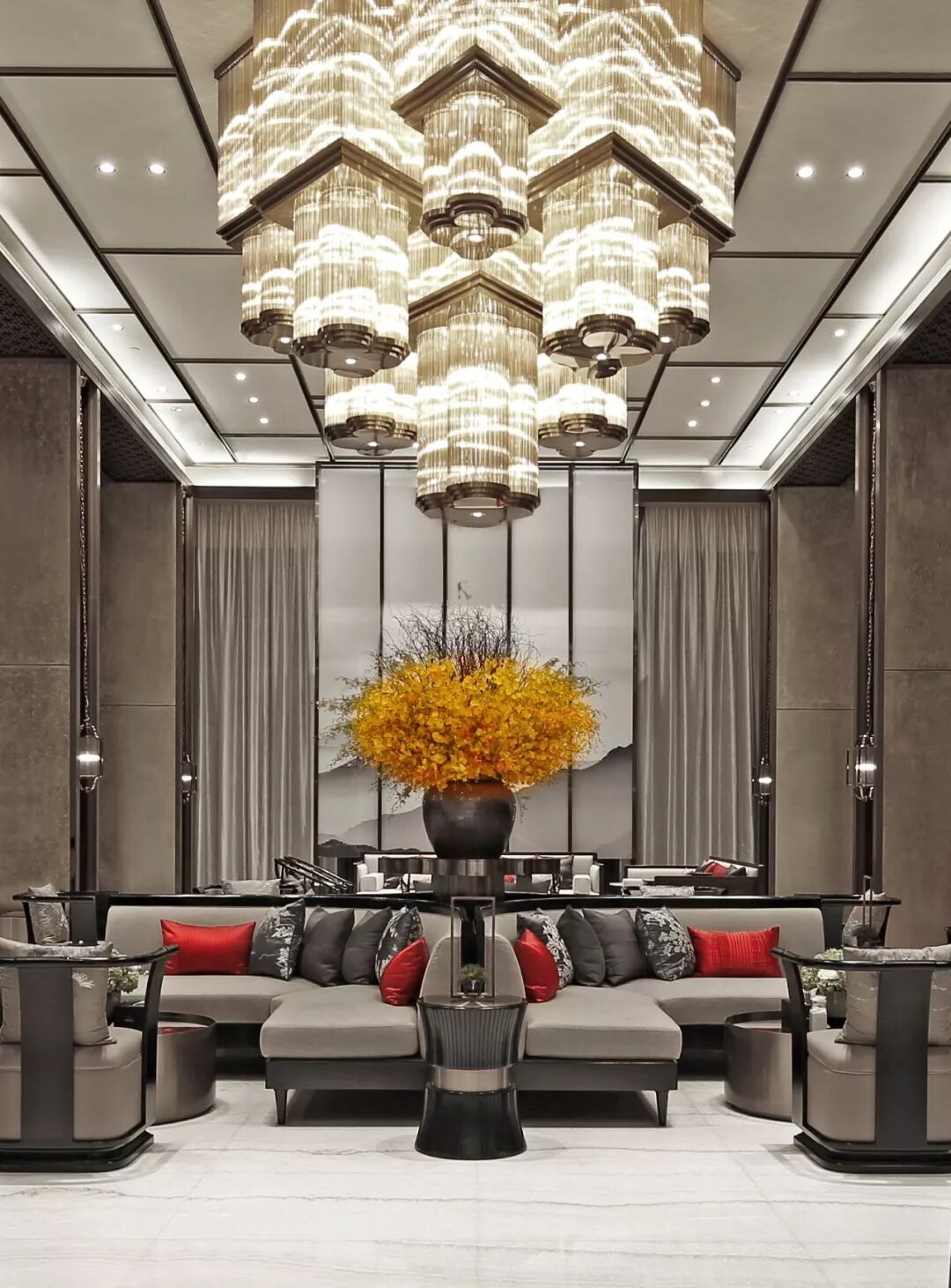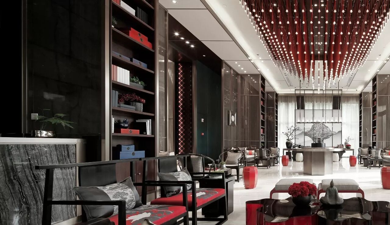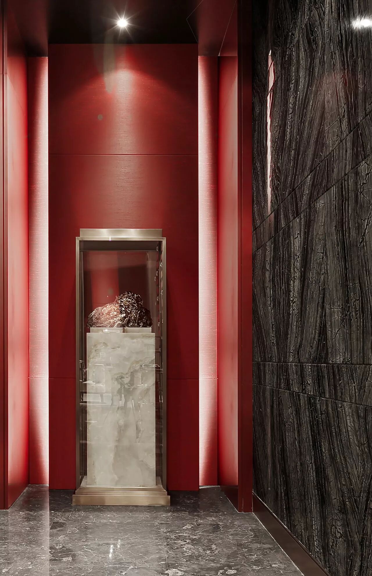 由洽谈区入内,是安静的贵宾接待空间。整个空间排布稳重而富有节奏,形成平衡稳定的视觉效果。一派堂堂皇皇中,明艳的朱红、橙红,增添了空间情韵,倏尔引发历史的遐想。