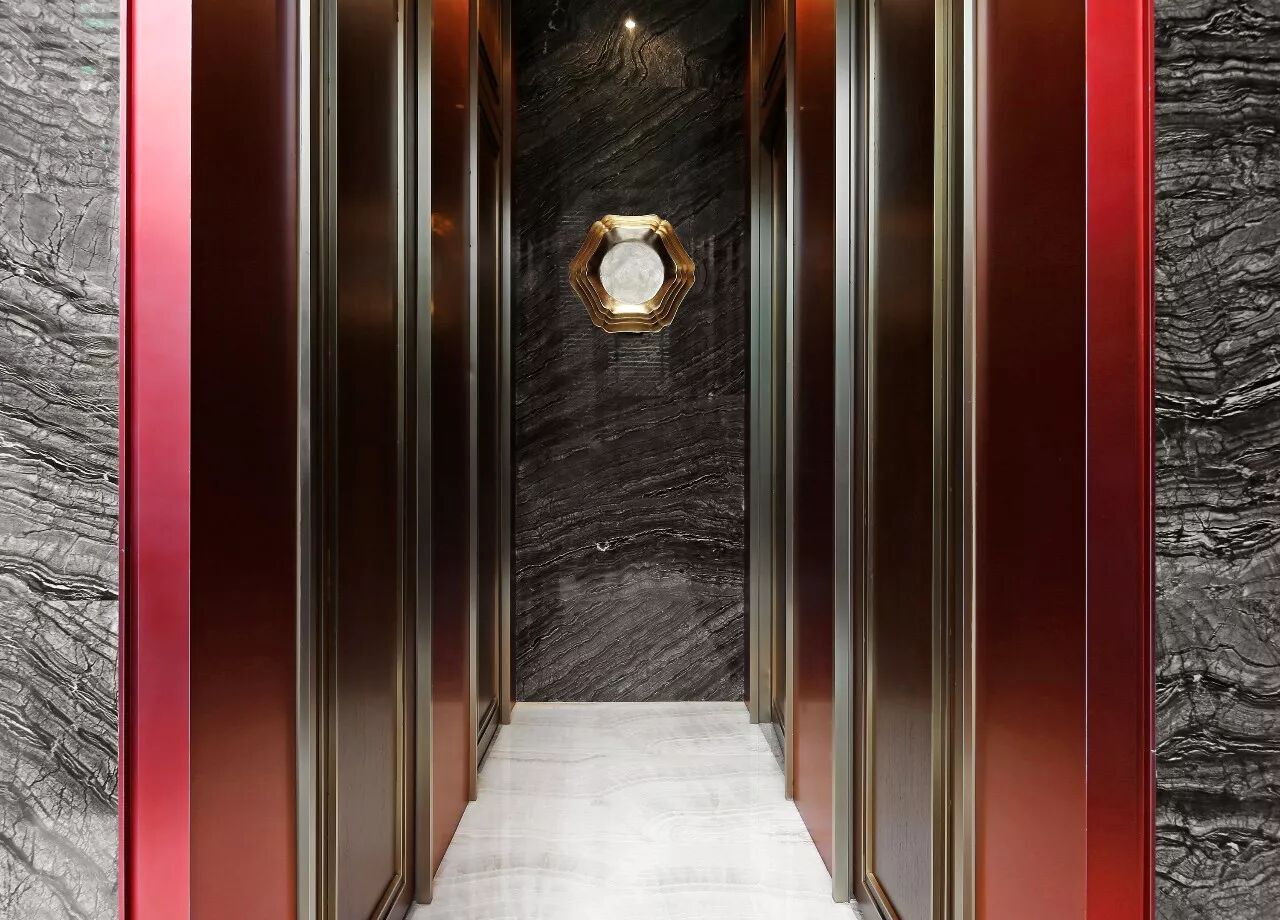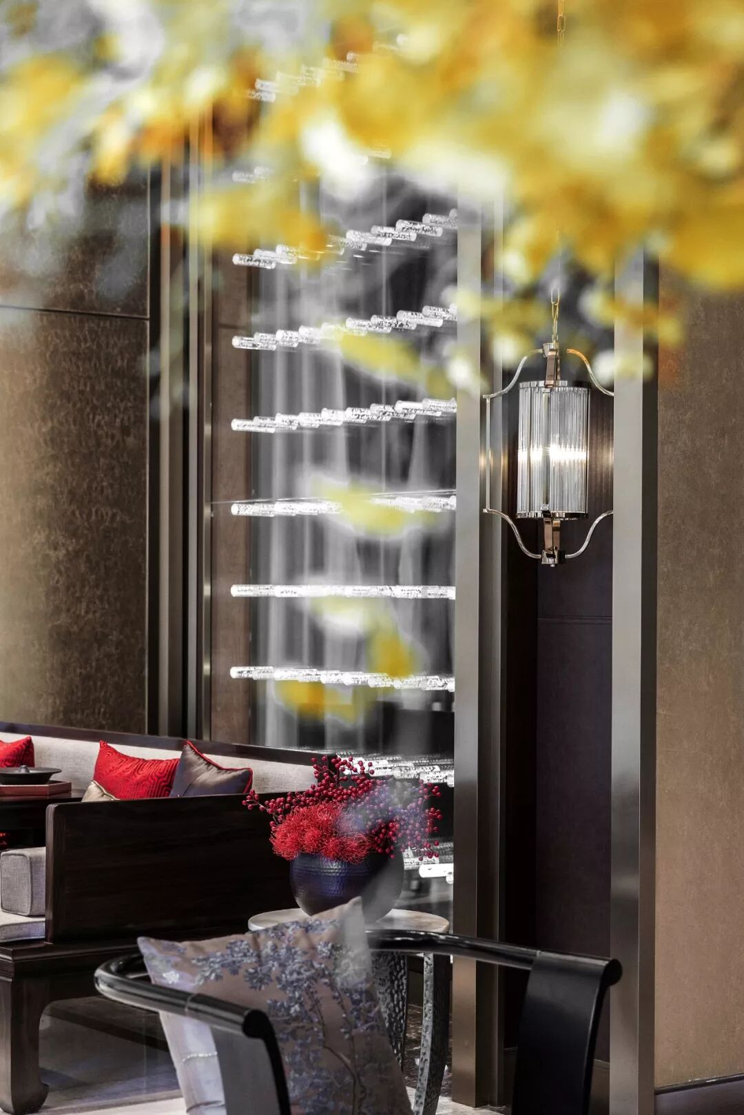 在东方式的审美意趣中,艺术灵感随处可见,走道的尽头又是一个瑰奇的精神世界。设计师以中国特有的文化艺术遗产瓦当、门钉元素构图设景,创意独具,韵致盎然。