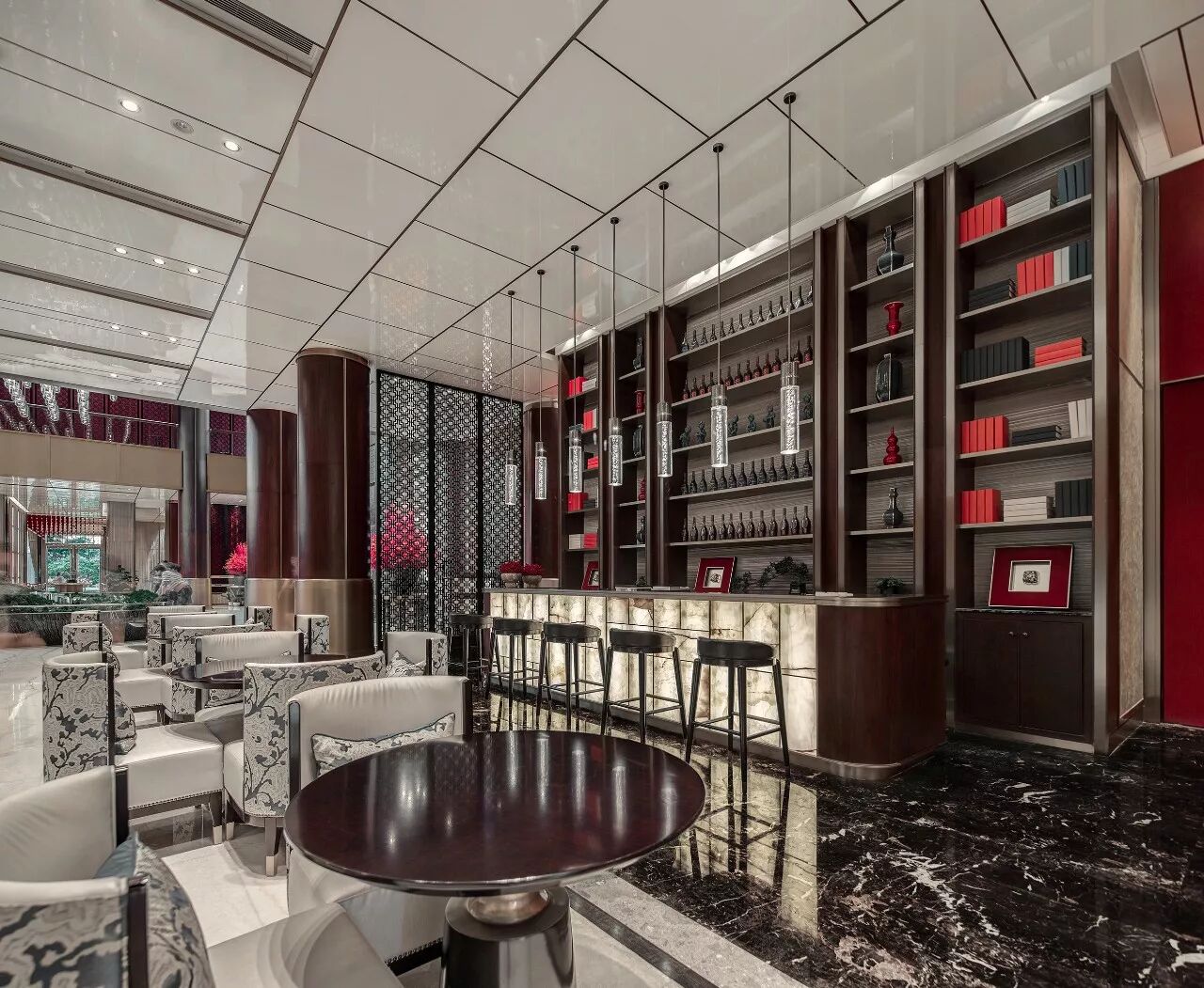 吧台右侧墙体是设计的妙笔,印玺等传统元素的规律组合,构思巧妙,穿越时空,似有红墙宫里万重门的历史风情。