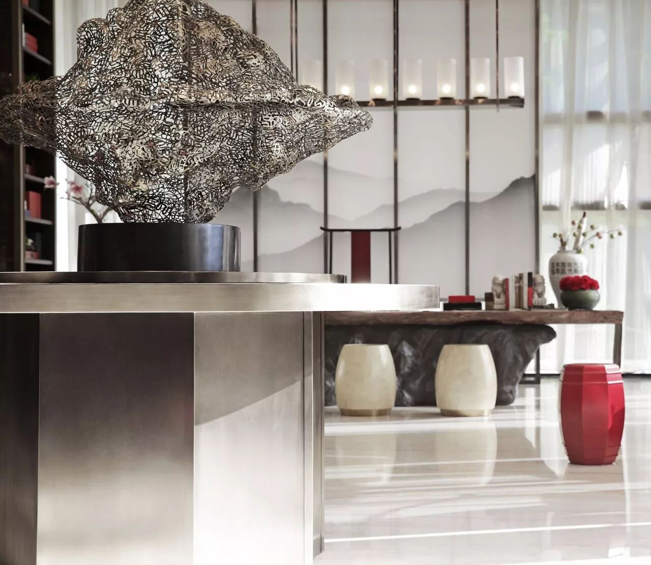 空间左右对称,白色大理石雕塑,聊为助意,增添了新的意趣。右侧的接待台安然静置,其后的云石背景墙,温润中散发熠熠光彩,吸引着观者由此步入下一个空间。