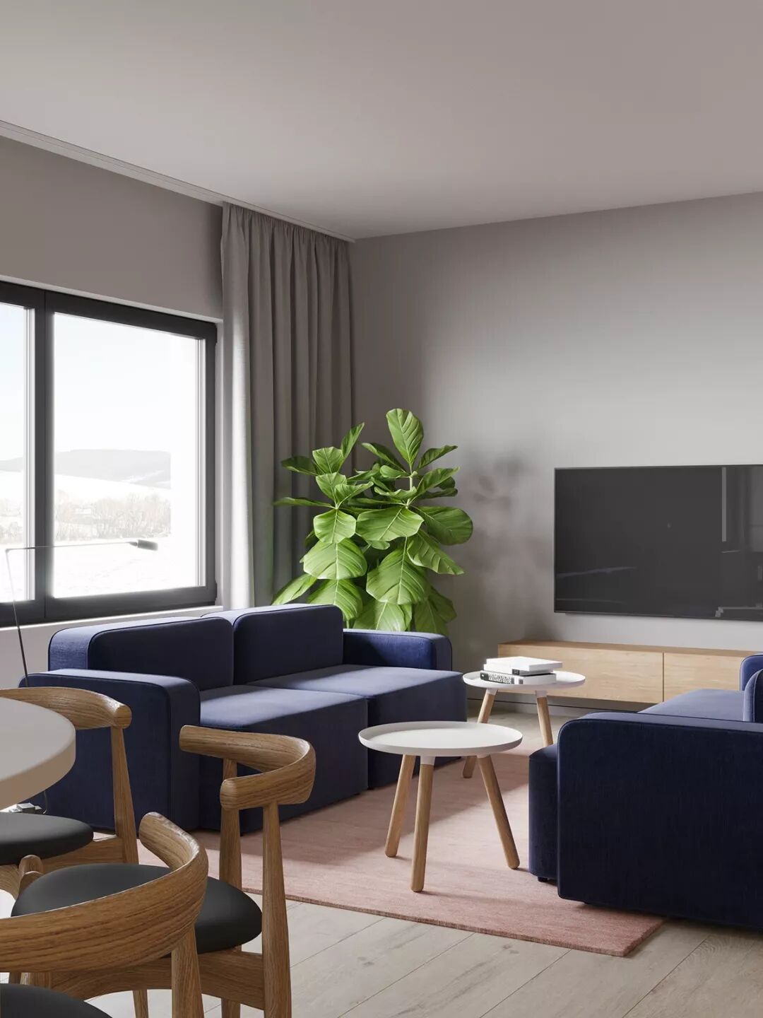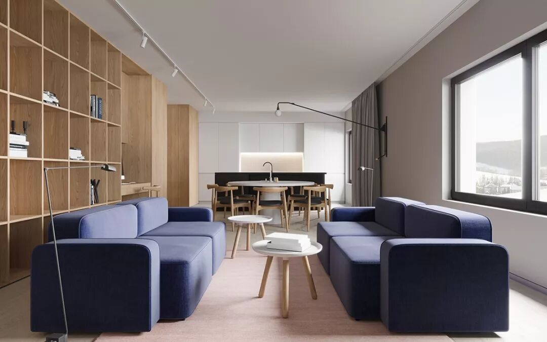 客厅是以蓝色沙发为主,将小边桌当茶几使用,搭配上粉色的地毯,展现出有柔软舒适的美感。