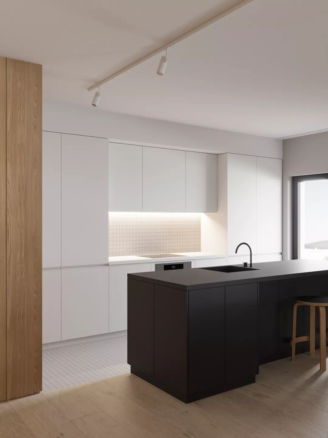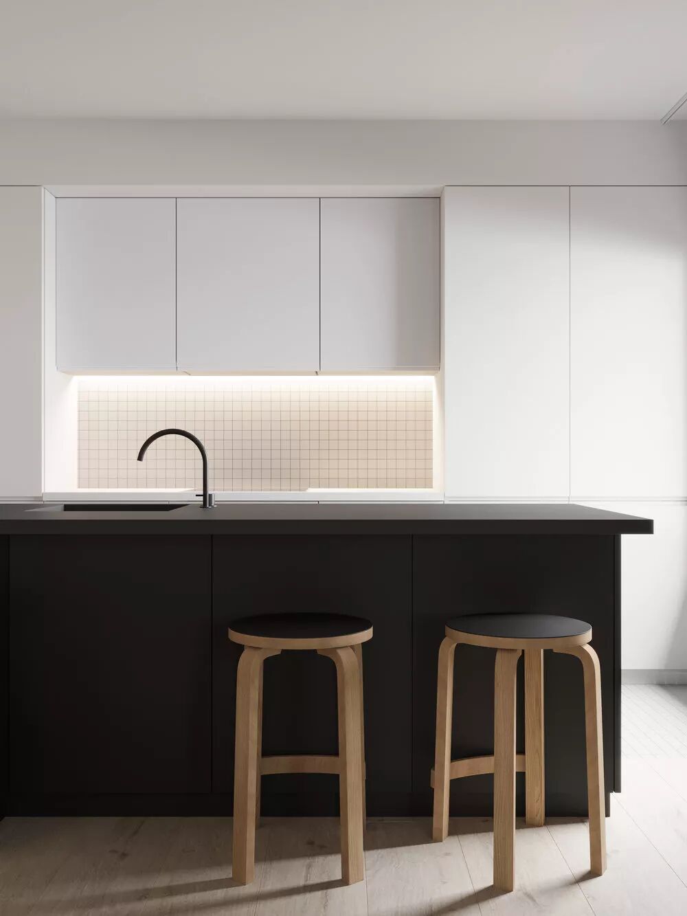 厨房的地板与其它区域不同,选用白色方格瓷砖铺面,黑色吧台、白色橱柜,简约的搭配设计很有格调。