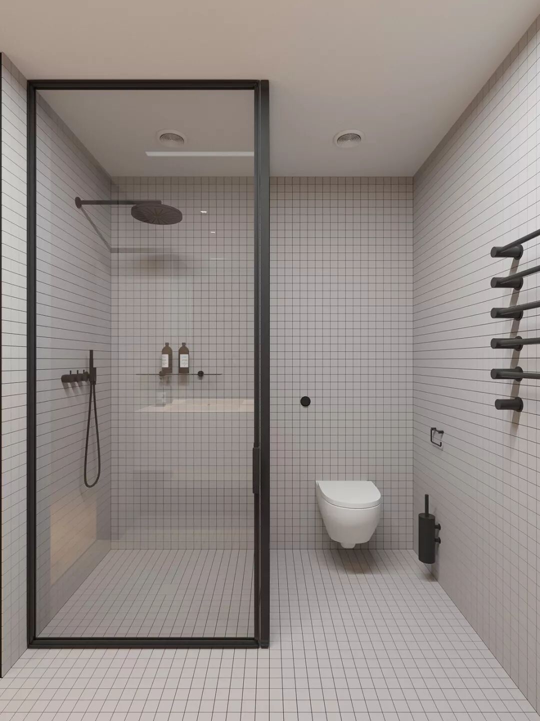 淋浴房用玻璃划分开,黑色的框架和花洒尤为显眼。