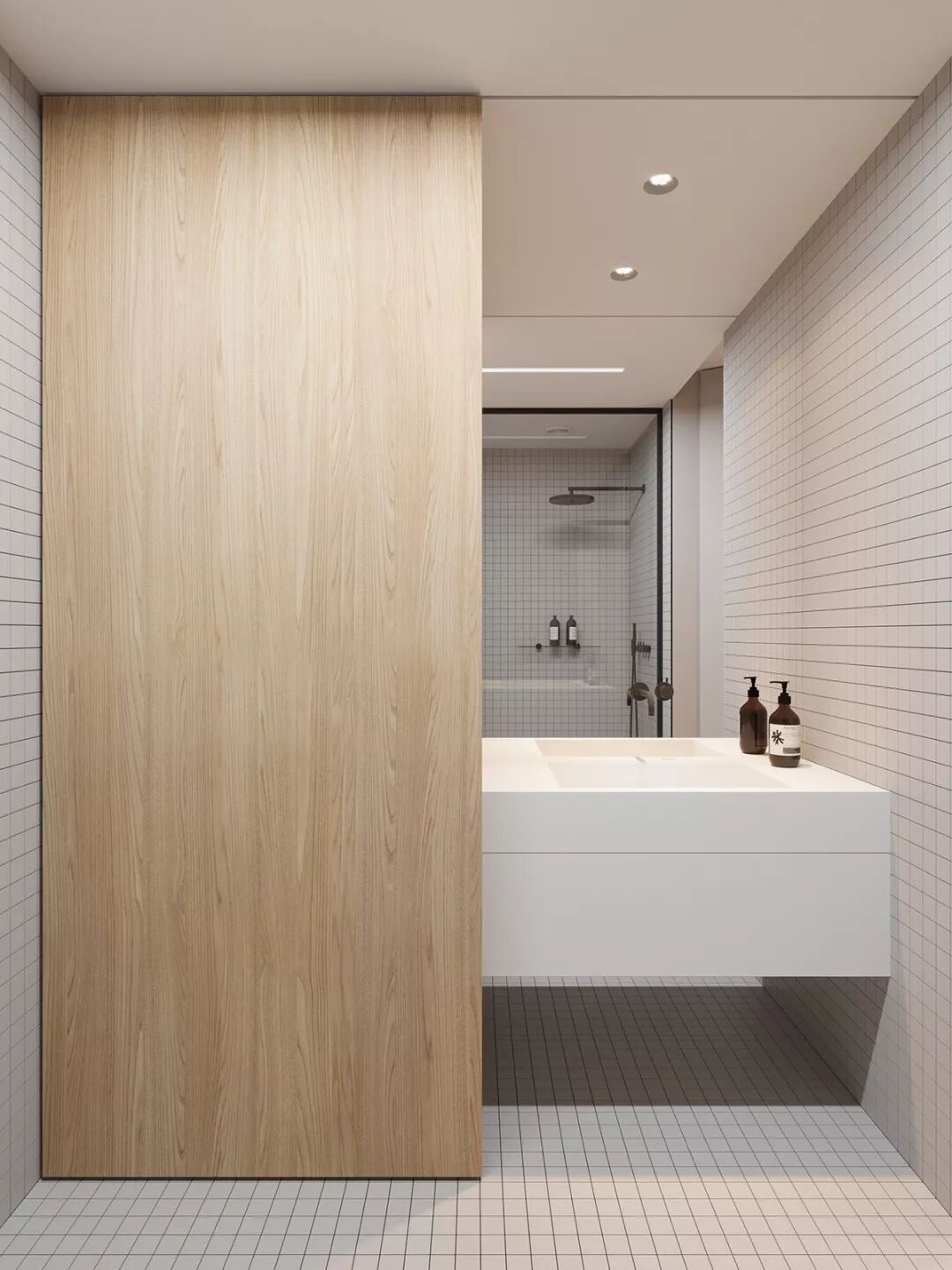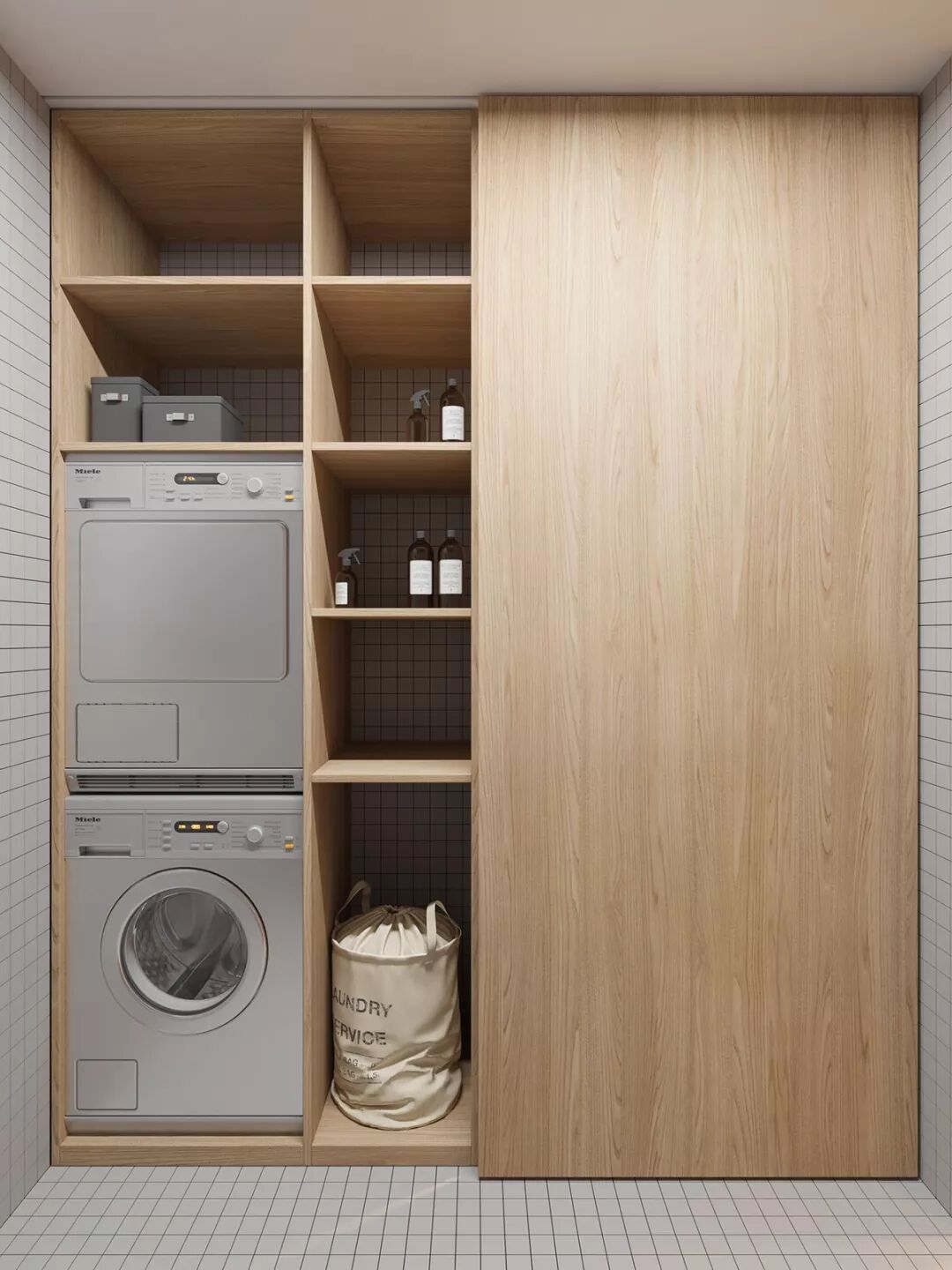 洗漱台边上的木制柜内,隐藏着洗衣机,推拉门的设计既简约又不占用空间。