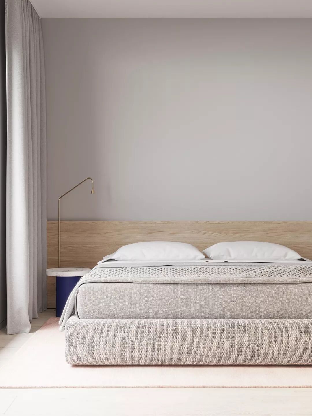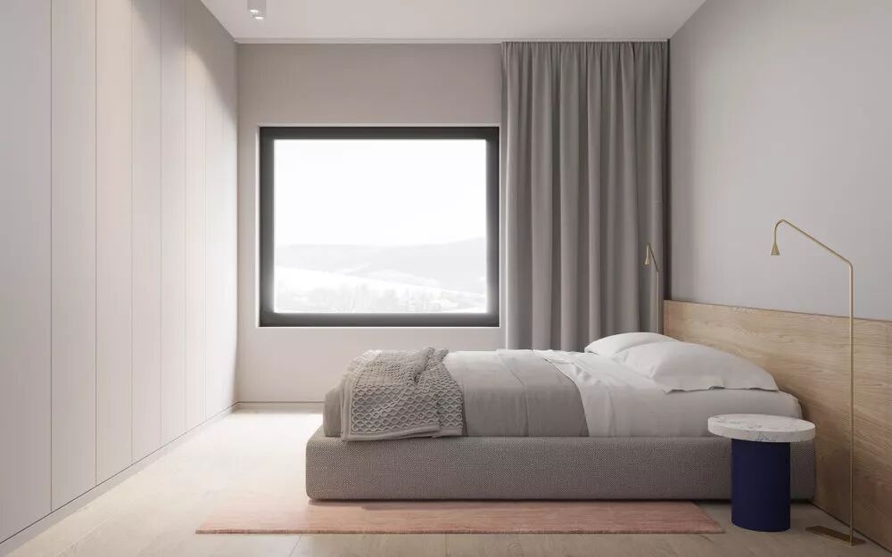 主卧室宽敞明亮,刻意留白的床头背景墙与木制的护墙板和白色窗帘搭配,简约素雅。