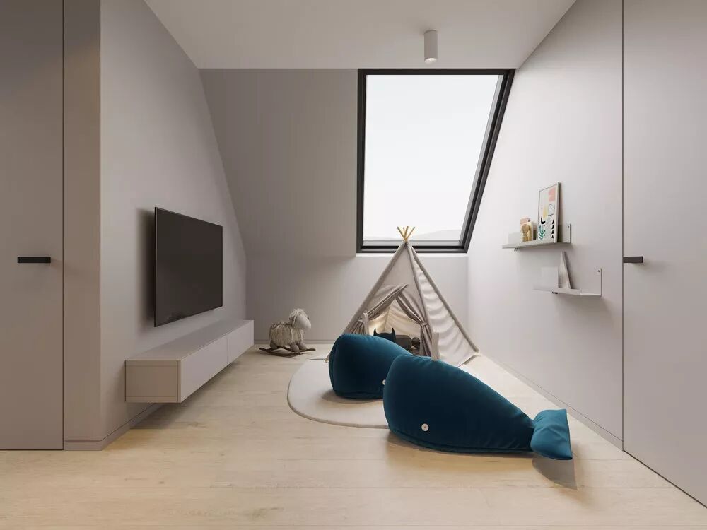 另一区域是专为孩子玩耍设计的,倾斜的屋顶设计了大天窗,采光非常不错。孩子平时在这玩耍时,能够拥有一个更明亮、宽敞的空间感。