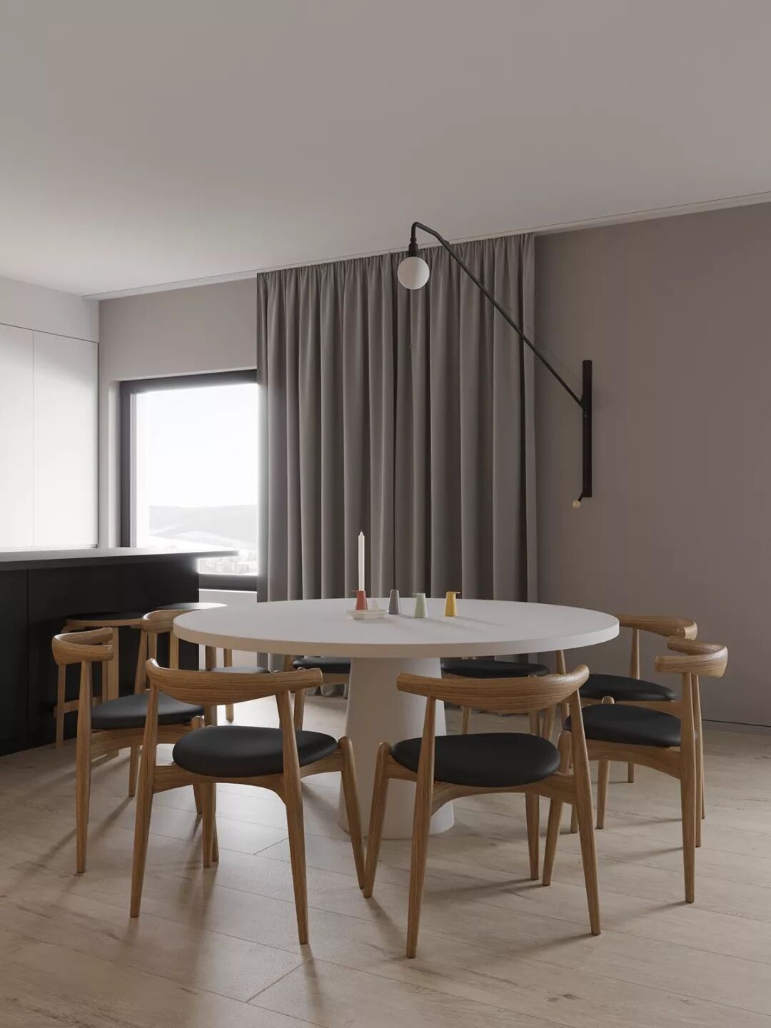 餐厅在客厅边上,一张圆形的白色木桌,围绕着 8 张木制餐椅整齐摆放,不管是平常吃饭还是待客,都没有多大问题。