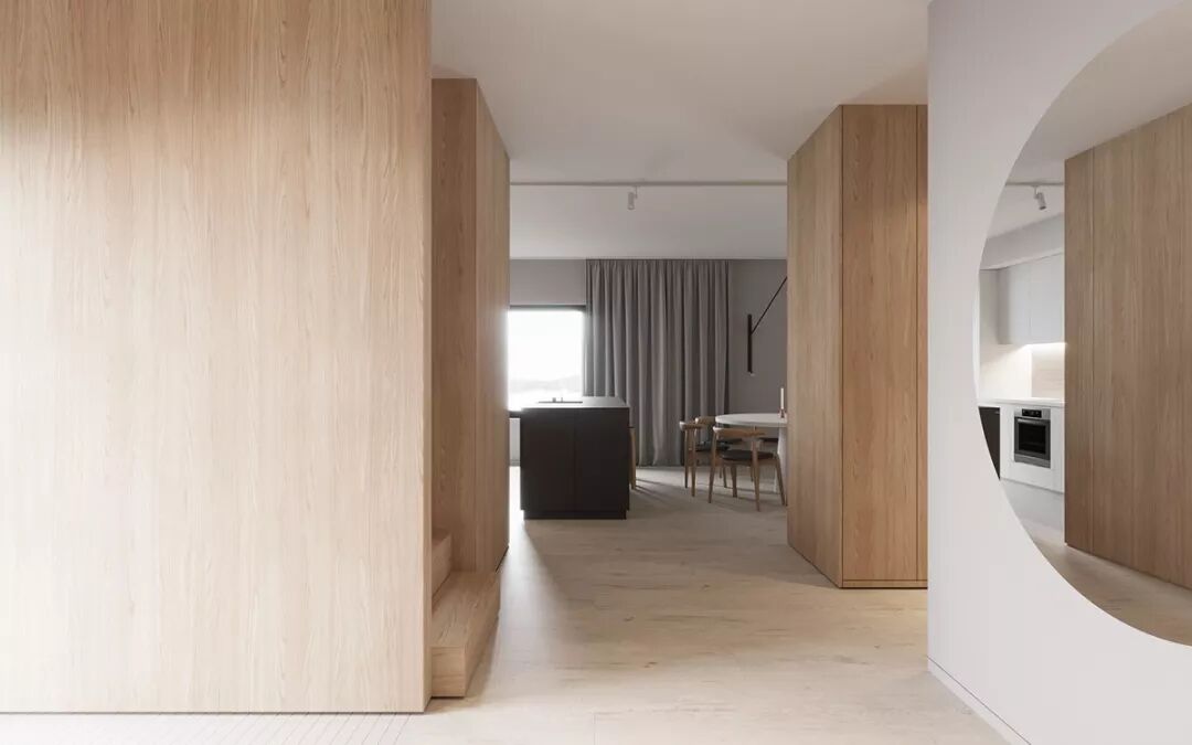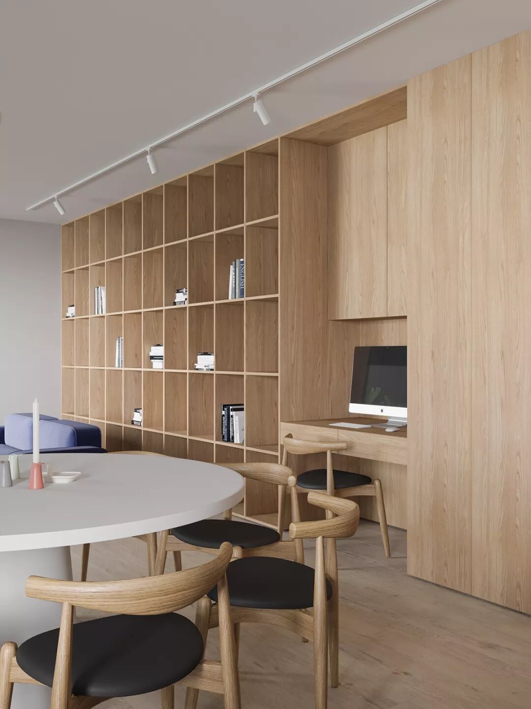 可能是原木色接近大地色,所以不管把它用在哪,都能给人一种自然、亲近、舒适的感觉。而随着近年来定制家具的全面开花,以及80、90后对于“佛系”的热衷,原木色家具也越来越流行。在现在极简风的装修中,好像没有原木色的配搭就会失去一丝自然、禅意的味道。而本案中,设计师也正是考虑到现代感和自然之间的关系,将室内装修搭配上木质元素,营造出一种质朴、低调、纯粹之感。