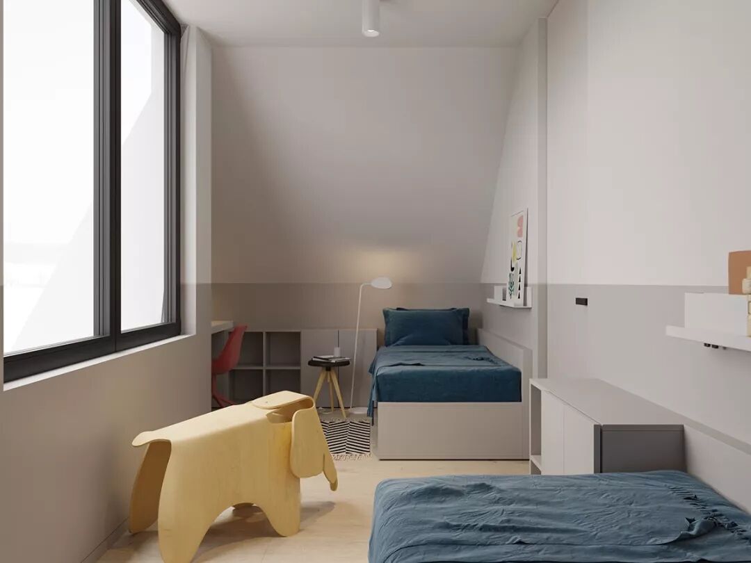 儿童房的色调非常温柔,两张床对称摆放,将角落空间巧妙利用,做成各种储物设计。