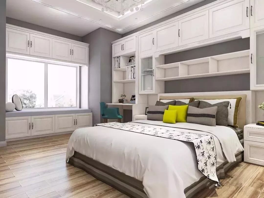 简单的一字型床头书桌,可以是独立的一体化书柜,也可以连接床头收纳,或者搭配悬挂柜,不管哪一种,都只比床头柜多了一倍的占地面积,而收纳却是床头柜的五倍。