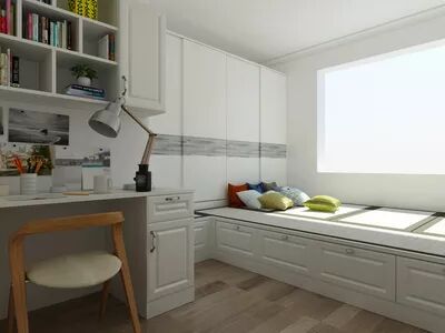 ▲次卧以功能性为主,榻榻米床设计简约,结合飘窗区域,使卧室空间得到良好的伸展。