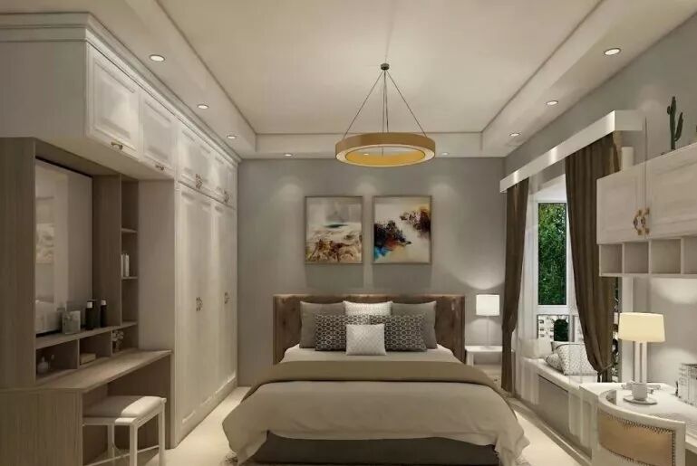 ▲衣柜利用上方的空间设计了一体式到顶柜。在下方打造了一个崁入式梳妆台,节省空间同时又与衣柜完美结合。
