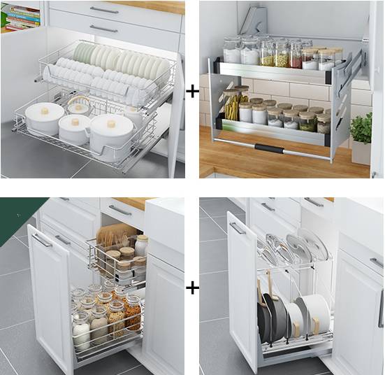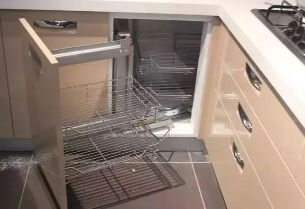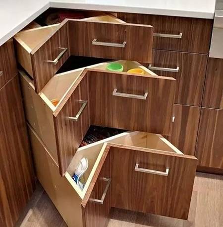 这种设计不少见,也利用了转角的空间,事实上,这样的设计真的是又贵,利用率又低,只能放小件物品,锅碗瓢盆一个都放不下。所以,良心推荐就是拉篮!