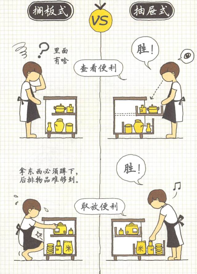 地柜的收纳技巧就是活用抽屉,弯腰即取!