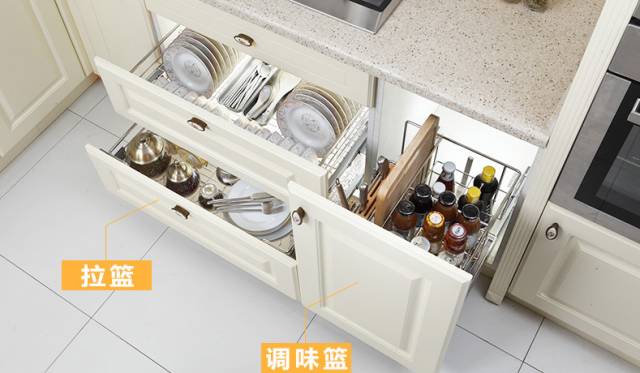 地柜:最复杂的也只有5,6种‘积木’组合而成的。设备柜为了装下设备而做的,比如消毒柜,水槽柜,灶台柜;储物柜的主要功能是储物,主要有隔板柜,拉篮柜,抽屉柜。