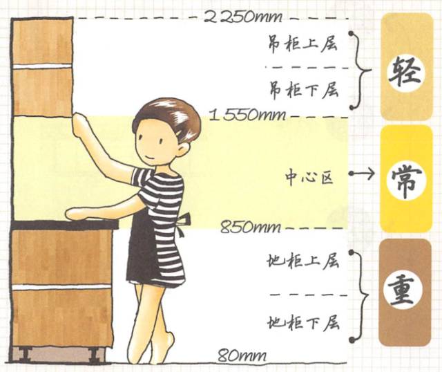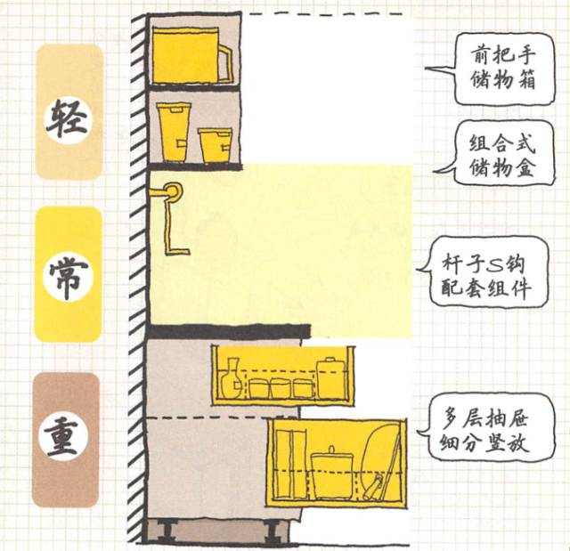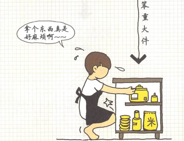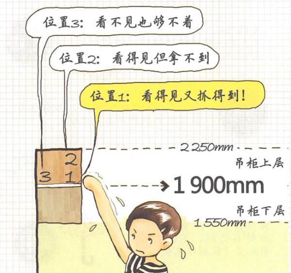 这里是寸土寸金,无论是厨具、电器还是调味品,如果不是每天,每吨频繁使用的话,请不要占用这块宝贵的区域;这个区域的关键词是