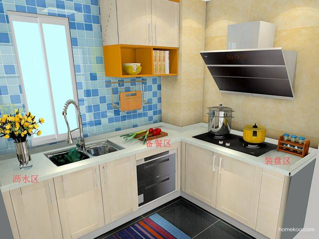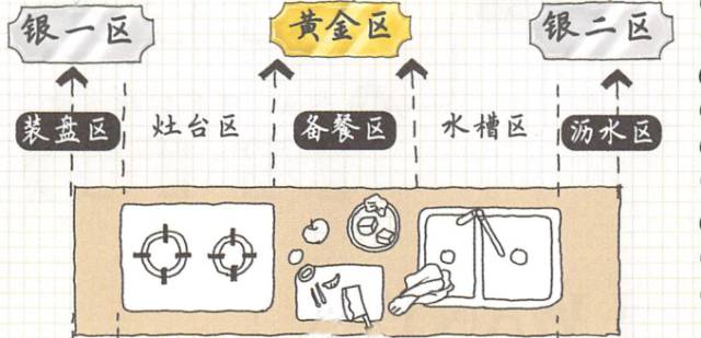 黄金区(备餐区):放砧板、菜刀,切菜的区域。活儿最多,东西也最多;所以至少要600mm,最好是达到800mm;