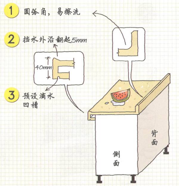 台面材质选择,需考虑耐污易清洁的,不建议选择浅色台面;