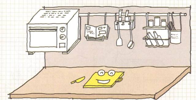 分清主次,在备餐区,主:刀和砧板,配:调料,勺瓢,盆。所以,让次要物品上墙就是一个很好的办法,既不占用配餐区的东西,又能顺手使用!