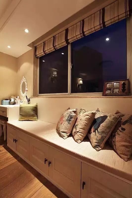 在卧室设置飘窗,没有沙发,没有椅子,但你有飘窗,在飘窗上铺上一层柔软的坐垫,再放几个靠枕就能让你轻松拥有一个美好的休闲角落。