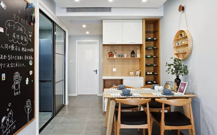 餐厅一派自然温馨之气,原木色的餐桌椅,白色与原木色搭配的收纳柜,餐厅背景墙的一个圆形的收纳框,还有一些可爱的玩偶,生动有趣。