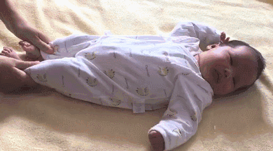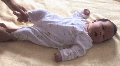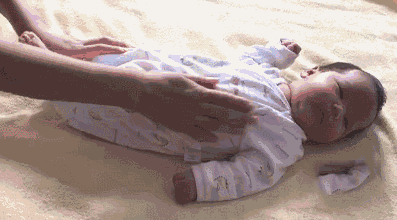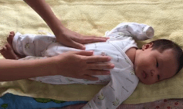 宝宝平躺,大人双手分别轻轻抓住宝宝的两个小腿,让宝宝屈膝;慢慢推压宝宝的双腿,使两膝盖并拢,抵住宝宝的小腹;