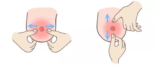 以乳头为中心,双手食指放在乳晕两旁,先略向下压,再向两旁推开,然后推回;再把双手食指放在乳晕上方和下方,做同样的动作。