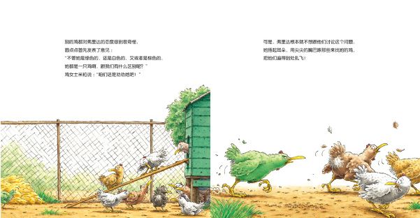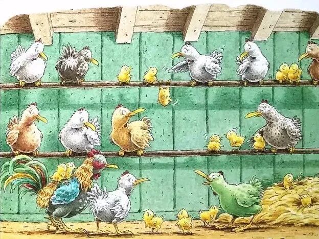 “喔喔喔喔喔,”鸡先生大叫着,通知所有的母鸡都来开会,他问大家,“谁能生出最美丽的蛋?” “咯咯哒,当然是我啦! 我生的蛋,是绿色的,当然是最美丽的啦!” 弗里达开心地想。