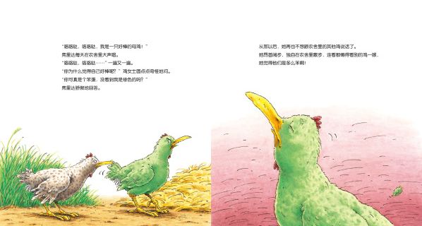 鸡先生诺维奇特别喜欢弗里达,他还从来没见过绿色的母鸡呢,真漂亮啊!不过,诺维奇想到一个问题:“漂亮的母鸡弗里达能生出最美丽的蛋吗?”