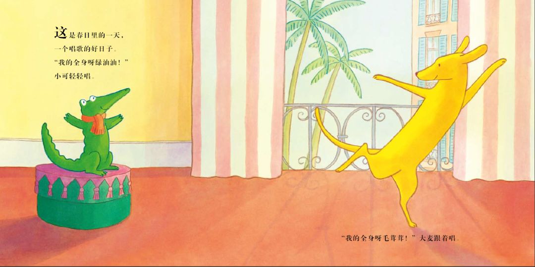 这是春日里的一天,一个唱歌的日子。小可轻轻唱:“我的全身呀绿油油!”大麦跟着唱:“我的全身呀毛茸茸!”