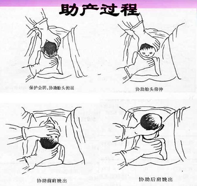 胎膜破裂,羊水流出,婴儿即将出生,胎头移近到阴道口,脸朝向妈妈的脊椎,这个姿势便于孩子离开母体。胎头可以用肉眼看见时,医生会告诉妈妈此时全身放松,因为如果孩子出来的太快,可能会有撕裂会阴处皮肤的危险。