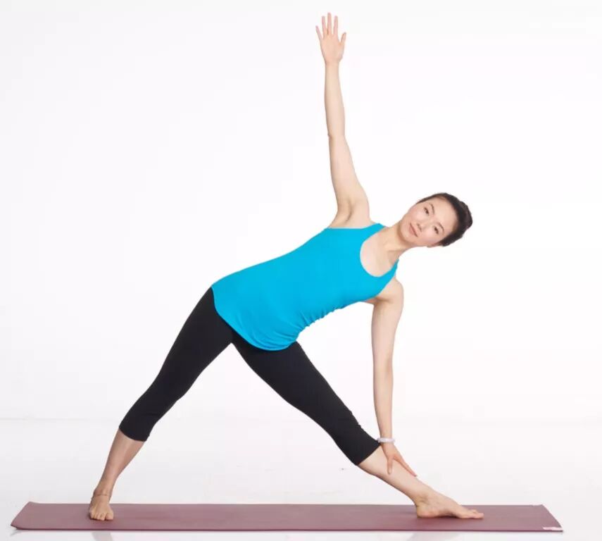 (3)三角式 站姿,双脚分开大约两个到两个半肩膀宽。右脚尖外展,左脚尖内收。吸气,手臂平展体侧。呼气,上身平移向右,向下,让右手去接触地面。