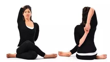 (1)束角式 坐姿,屈膝,脚心相对,双手十指相扣抱住双脚。吸气,把脊柱伸展打开。呼气,上身前屈。(注:骨盆歪斜,在这里膝盖会一高一低,控制将更多意识放在你感觉比较紧张的那一侧上。)