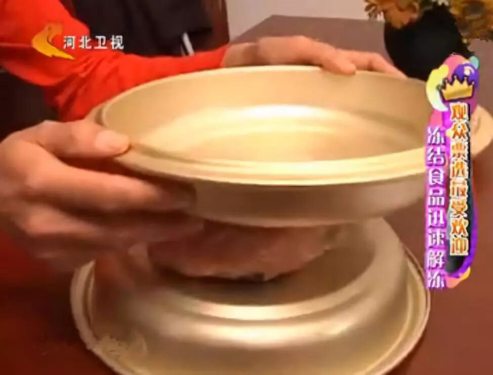 利用铝制品极强的导热性,把冻肉两端紧贴在铝锅上时,冻肉就会在很短的时间化开了。如果家中没有铝锅,铝盖、铝盆同样可以。