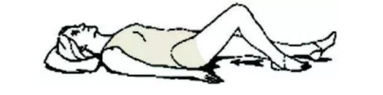 双足着床板,屈膝。抬起一膝渐渐向乳房方向微曲,双手抱膝拉向胸前,回原双足方位,另膝做上述运动,每天做10次。