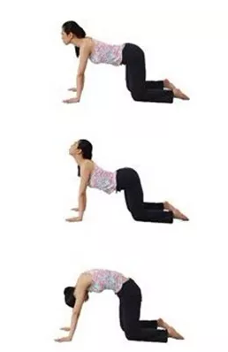 跪坐,双腿打开与肩同宽,双手放在双膝前一小臂加两手的距离撑住,吸气抬头,脊柱向下弯曲,呼气低头,脊柱向上弯曲。保持过程缓慢,吸气呼气各数5秒。每天早晚各做一组,一组10次。