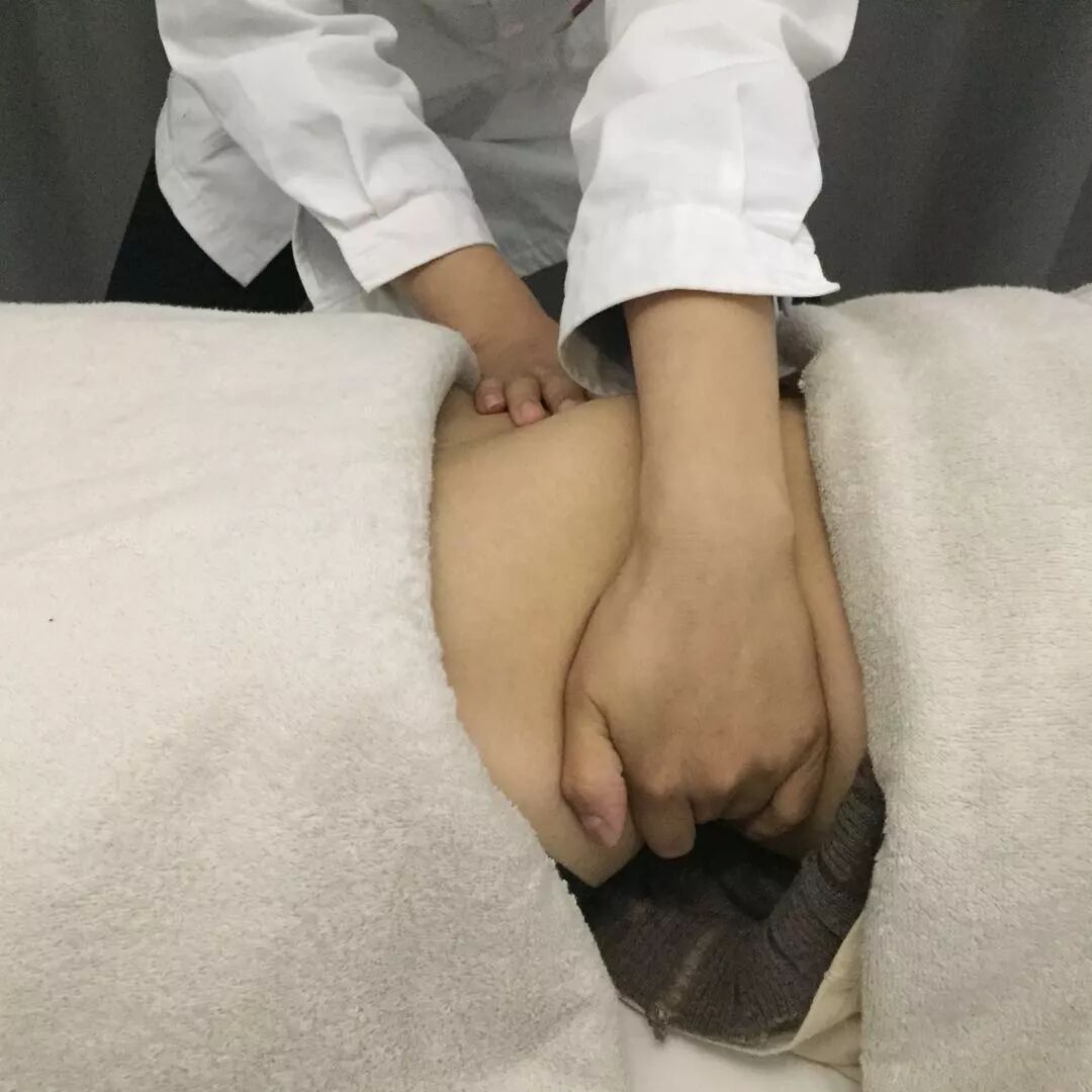 从剑突部开始,操作者用两手手根把两侧腹直肌向中间对合挤压,从上到下每个部位停留30秒,操作到耻骨联合为止。