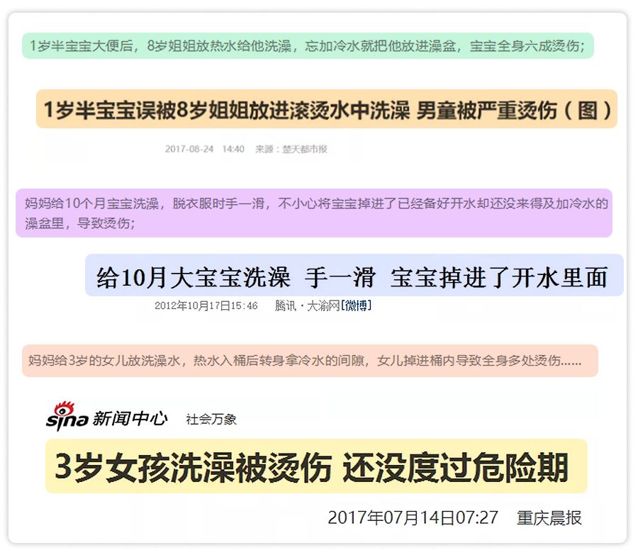 经过调查发现,不少家长在给小孩用澡盆泡澡时,总是先放热水,再加入冷水。这是一个很危险的习惯,容易导致小孩烫伤!