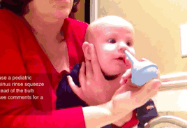 洗鼻时一定要让孩子张开嘴,或长喊「啊啊啊」,让耳朵内外的压力一致,孩子舒服了,可能就能接受了。
