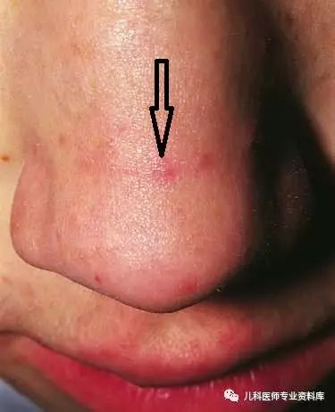 这是因为孩子用手反复向上揉鼻导致的鼻部皱纹,在鼻子的中下 1/3 处(自己可以向上推一下鼻子,能感觉到这个地方正好是鼻软骨处,挡住手,向上推不上去了),如上图箭头所示。
